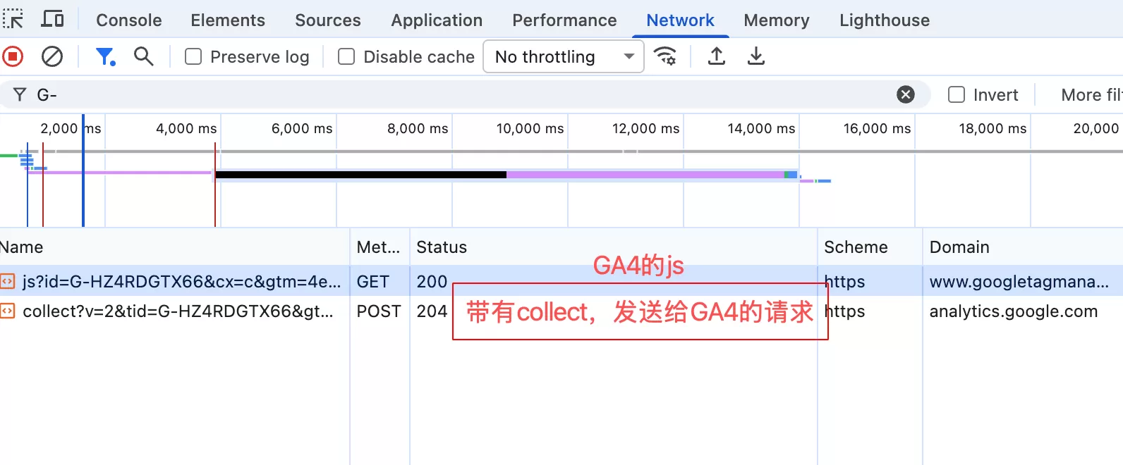 验证方式:在Network(网络)里用“G-”或“collect”去过滤