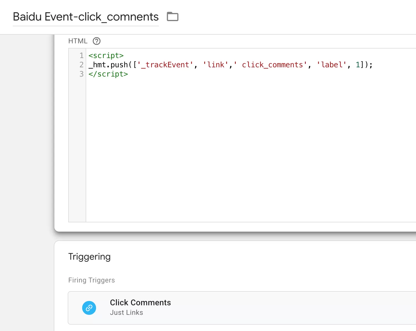 在GTM中点击「代码」—「新建」—「选择一个代码类型以开始设置」——「自定义HTML」,命名为“Baidu Event-click_comnents”,做如下设置: