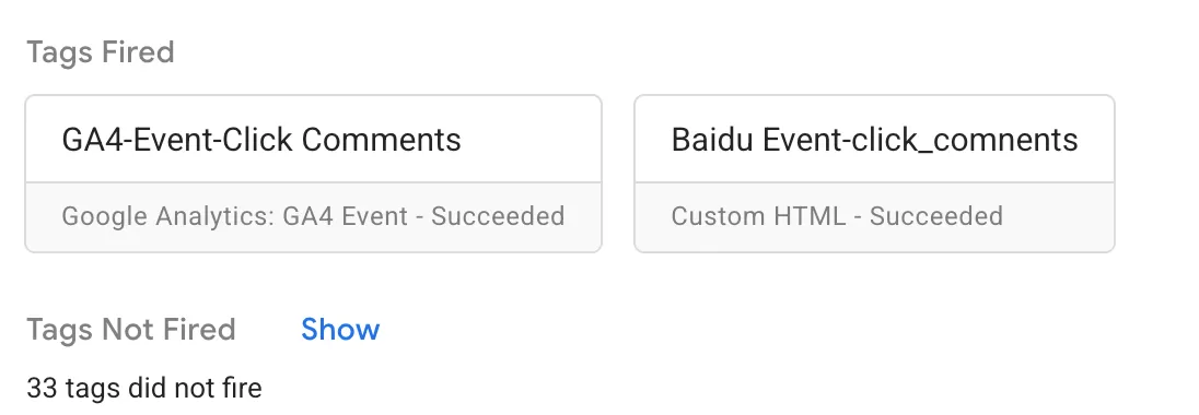 在GTM里预览,然后点击评论,可以在Tag Assistant里看到代码(Tags)是准确触发: