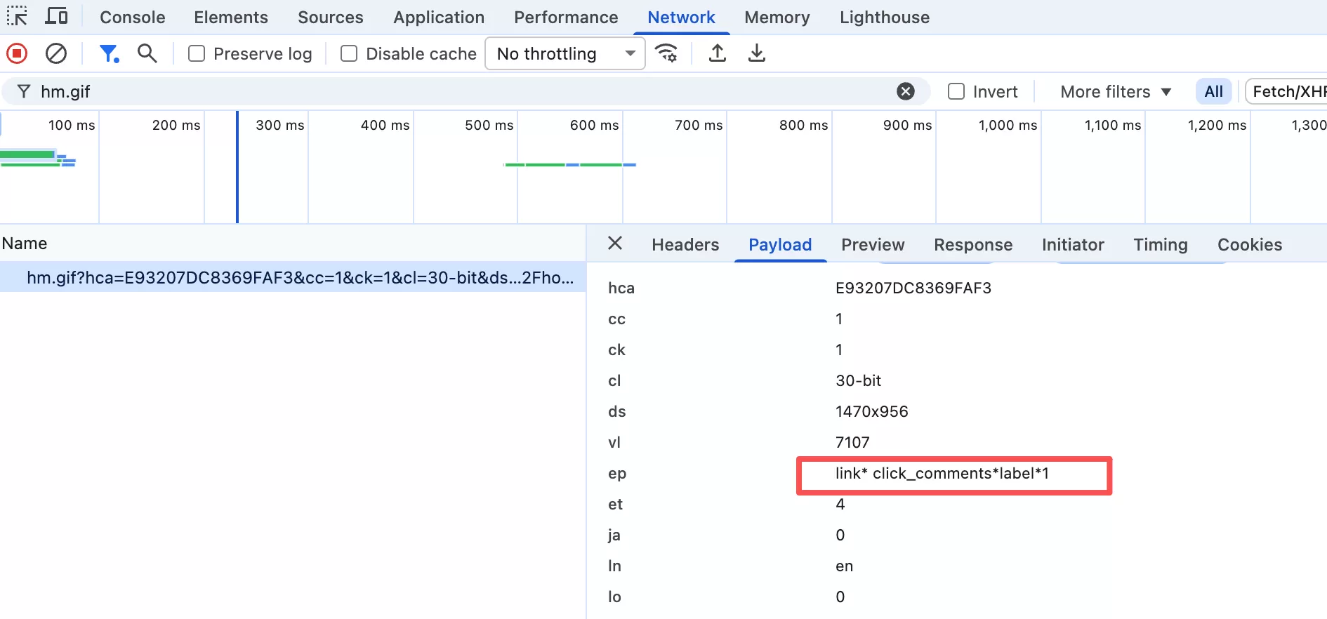 打开浏览器 → F12 → Network → 搜索”hm.gif”,这个就是百度统计的跟踪请求,找到ep,可以看到设置的事件信息在这里: