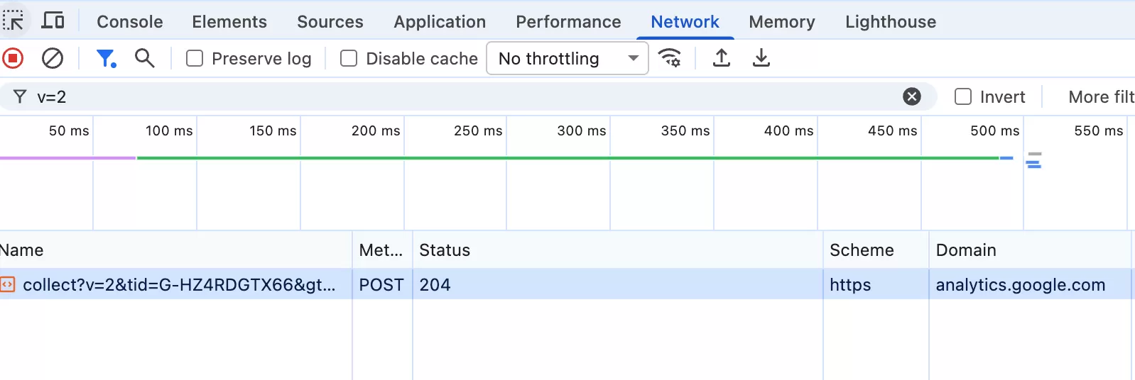 其次,在浏览器开发者工具里的网络里查看,用v=2去过滤,看是否有请求是否发送到 https://www.google-analytics.com/g/collect